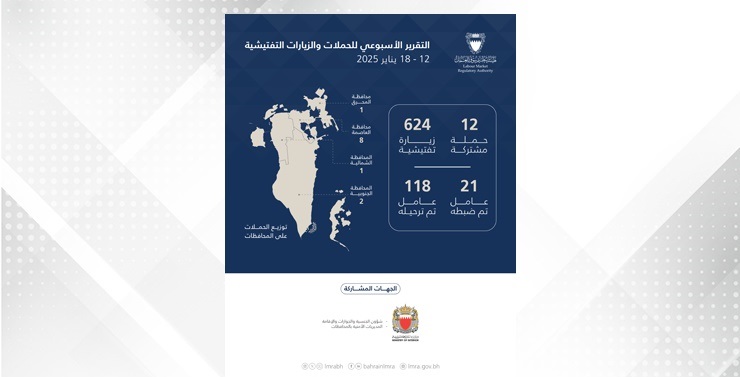 نفذت هيئة تنظيم سوق العمل 636 حملة وزيارة تفتيشية، خلال الفترة الممتدة من 12 إلى 18 يناير، وأسفرت عن ضبط 21 عاملاً مخالفًا وغير نظامي، فيما بلغ عدد المرحلين خلال الفترة المذكورة 118 مخالفًا.