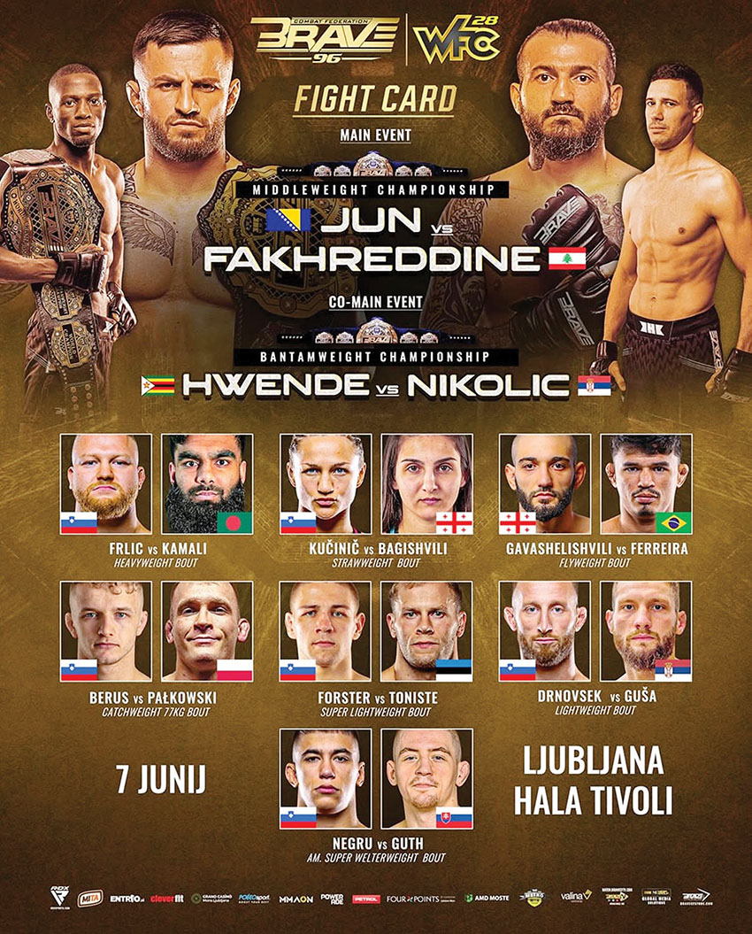 ومن المنتظر أن تشهد سلوفينيا من خلال احتضانها لبطولة BRAVE CF 96 إقامة حدثين على لقبين عالميين؛ حيث من المنتظر أن يخوض بطل الوزن الخفيف الثقيل المقاتل البوسني إركو جون مواجهة قوية أمام البطل السابق في الوزن المتوسط والثقيل المقاتل اللبناني محمد فخر الدين في نزال الحدث الرئيسي لهذه النسخة.