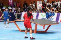 وتظهر الصورة جانبًا من التغطية التلفزيونية المباشرة، حيث يتواجد فريق من المحللين والمعلقين الرياضيين الأكفاء في الأستوديو الخاص داخل الصالة، مقدمين قراءات فنية وتحليلات معمقة لأداء المنتخبات واللاعبين.