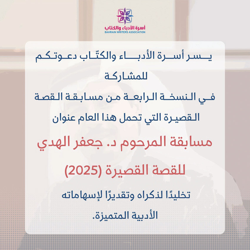 أعلنت أسرة الأدباء والكتاب انطلاق النسخة الرابعة من مسابقتها السنوية للقصة القصيرة، التي تُنظَّم هذا العام تحت شعار »مسابقة المرحوم د. جعفر الهدي للقصة القصيرة 2025«، تخليدًا لذكرى الراحل وتقديرًا لإسهاماته الأدبية المتميزة في المشهد الثقافي البحريني.