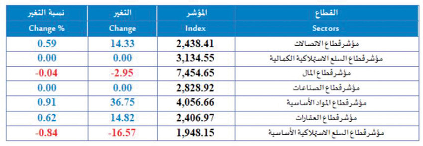 واستحوذ على الـمركز الأول في تعاملات هذا الأسبوع قطاع المواد الأساسية، حيث بلغت قيمة أسهمه الـمتداولة مليونين و130 ألفا و606 دنانير بحرينية أو ما نسبته 70.79% من إجـمالي قيمة الأسهم الـمتداولة وبكمية قدرها مليونان و394 ألفا و690 سهما، تـم تنفيذها من خلال 92 صفقة.