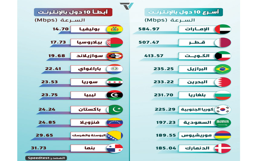 وأشار التقرير إلى أن الإمارات تصدّرت القائمة عالميًا بسرعة بلغت 584.97 ميغابايت/ثانية، تلتها قطر (507.47 ميغابايت/ثانية) والكويت (413.57 ميغابايت/ثانية)، في حين جاءت السعودية في المركز الثامن بسرعة 197.23 ميغابايت/ثانية، وهو ما يبرز الحضور القوي لدول الخليج العربي في طليعة المشهد الرقمي العالمي.
