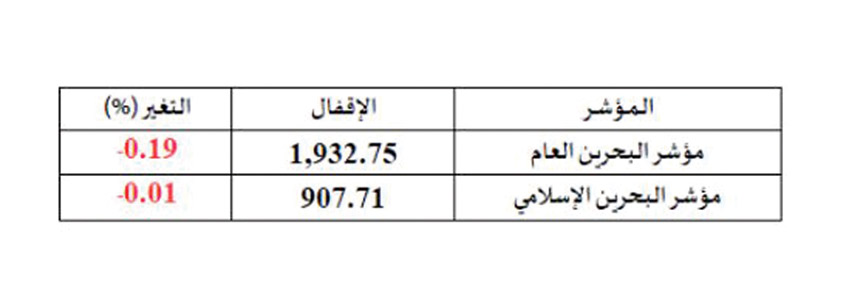 أقفل «مؤشر البحرين العام» يوم أمس الثلاثاء عند مستوى 1,932.75 بانخفاض وقدره 3.68 نقاط مقارنة بإقفاله يوم الإثنين، في حين أقفل «مؤشر البحرين الإسلامي» عند مستوى 907.71 بانخفاض وقدره 0.11 نقطة مقارنة بإقفاله السابق.