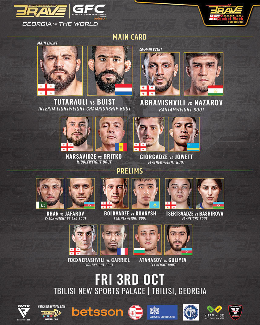 الحدث يشكل المحطة الأبرز في النسخة الخامسة من أسبوع BRAVE الدولي للقتال، حيث يتضمن تسعة نزالات نارية تجمع أبرز نجوم جورجيا أمام نخبة من المقاتلين العالميين.