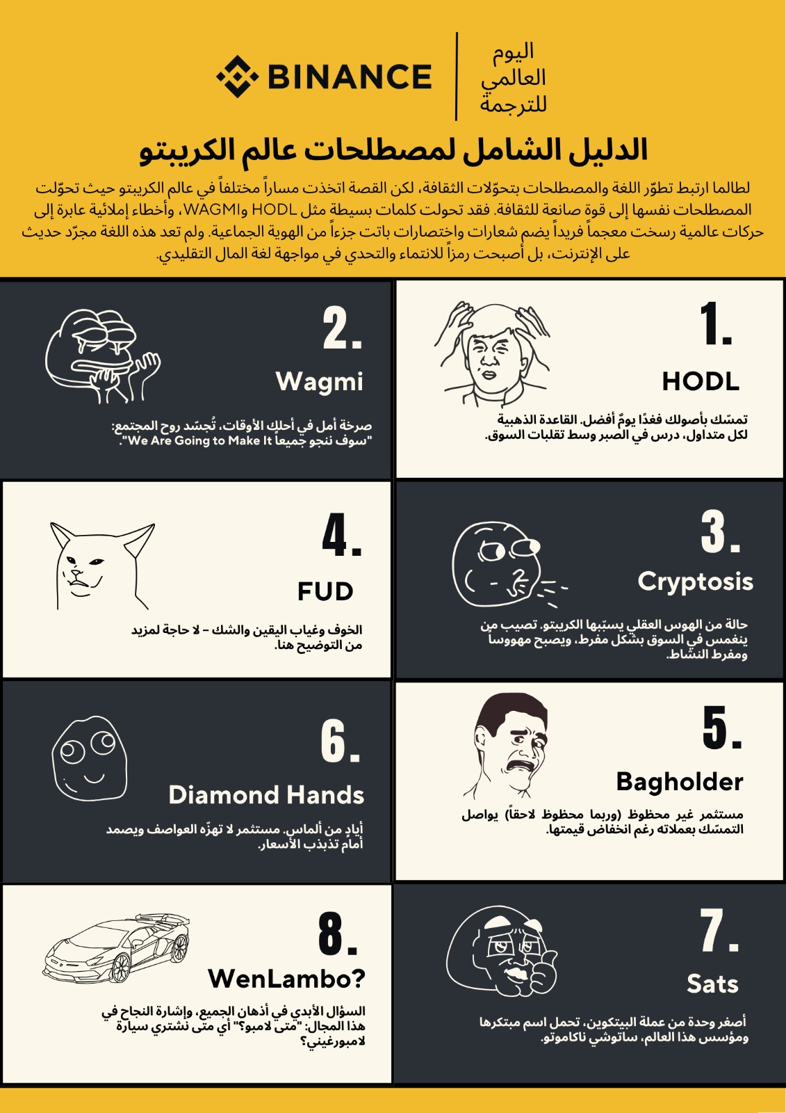 لطالما عكست اللغة ملامح الثقافة، لكن في عالم الكريبتو، تحوّلت اللغة إلى الرابط الذي يجمع مجتمعاً عالمياً بأكمله. فقد بدأت القصة من أخطاء إملائية واختصارات ظهرت على منتديات الإنترنت المغمورة – مثل "HODL" وتعني "تمسّك بالحياة"، و "WAGMI" وتعني "سوف ننجو جميعاً" – لكنها سرعان ما أصبحت شعارات تُلخّص توجّه حركة كاملة. وفي اليوم العالمي للترجمة، يجدر بنا التوقّف والتفكير كيف أن هذه الكلمات لم تُنتج مفردات فحسب، بل صنعت ثقافة متكاملة.