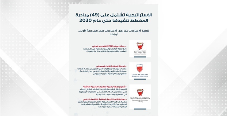 وأشار إلى أنه في إطار المتابعة المستمرة من قبل اللجنة الوزارية لتقنية المعلومات والاتصالات برئاسة الفريق أول معالي الشيخ راشد بن عبد الله آل خليفة وزير الداخلية رئيس اللجنة الوزارية لتقنية المعلومات والاتصالات، تم استكمال تنفيذ 6 مبادرات وطنية ضمن الاستراتيجية الوطنية للاقتصاد الرقمي، بالتنسيق مع الجهات الحكومية ذات العلاقة، وذلك من أصل 9 مبادرات ضمن المرحلة الأولى من الاستراتيجية والتي تشمل تنفيذ 49 مبادرة حتى عام 2030.