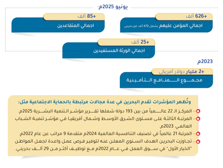وأفاد التقرير بأن عدد المؤمن عليهم في البحرين بلغ في يونيو 2025 أكثر من 626 ألفًا، منهم 470 ألفًا من غير البحرينيين، فيما تجاوز عدد المتقاعدين 85 ألفًا، ووصل عدد الورثة المستفيدين إلى أكثر من 25 ألفًا. كما سلط الضوء على اهتمام البحرين بفئة كبار السن عبر منظومة متكاملة من القوانين والسياسات التي تضمن لهم جودة حياة كريمة ومشاركة فاعلة في المجتمع، انسجامًا مع أهداف رؤية البحرين الاقتصادية.