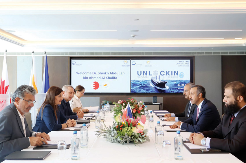 كما عقد معاليه اجتماع عمل مع السيدة مارينا حاجيمانوليس، وزيرة الشحن البحري في جمهورية قبرص، حيث تم بحث سبل تعزيز التعاون البحري بين البلدين، والتركيز على تبادل الخبرات وتطوير آفاق العمل المشترك في المجالات البحرية والخدمات المتعلقة بقطاع الشحن التجاري. وأكد الجانبان أهمية مواصلة التنسيق وتوثيق العلاقات بما يسهم في دعم التنمية الاقتصادية والرفع من مستوى الخدمات البحرية، مع التطلع إلى مستقبل أكثر تعاوناً وانفتاحاً في القطاع البحري بين مملكة البحرين وجمهورية قبرص.