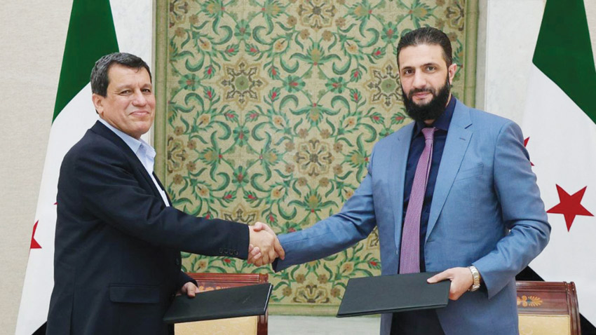 دمشق - (أ ف ب): أعلنت دمشق أمس الثلاثاء «وقفا شاملا لإطلاق النار» مع الأكراد في شمال وشمال شرق البلاد، عقب لقاء جمع قائد قوات سوريا الديموقراطية مظلوم عبدي مع الرئيس الانتقالي أحمد الشرع في دمشق، غداة اشتباكات بين قوات حكومية وأخرى كردية في مدينة حلب أسفرت عن مقتل شخصين. ويأتي إعلان وقف إطلاق النار بينما أخّرت خلافات كبيرة بين السلطات الانتقالية والإدارة الذاتية الكردية تنفيذ اتفاق تم التوصل إليه في مارس الماضي، وتضمّن بنودا عدّة حول دمج المؤسسات المدنية والعسكرية للإدارة الذاتية الكردية في المؤسسات الوطنية.