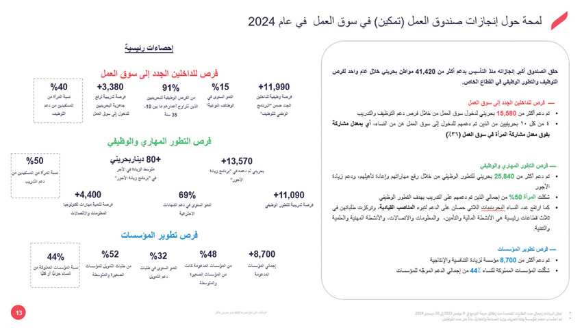 وأكدت نورة المطوع أن صندوق العمل (تمكين) حقق أكبر إنجازاته منذ التأسيس بدعم أكثر من 41420 مواطناً بحرينياً خلال عام واحد لفرص التوظيف والتطور الوظيفي في القطاع الخاص في 2024.