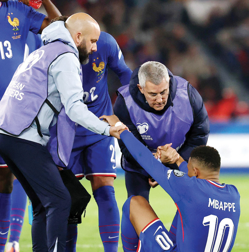 باريس - (أ ف ب): تعرّض قائد منتخب فرنسا لكرة القدم كيليان مبابي لإصابة جديدة بكاحله الأيمن، خلال مواجهة أذربيجان الجمعة في تصفيات مونديال 2026، وسيغيب عن رحلة الـ«زرق» إلى أيسلندا، بحسب ما أعلن الجهاز الفني للمنتخب.