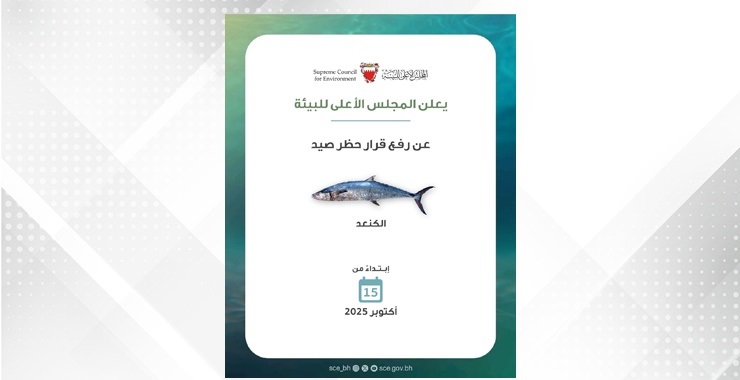 أعلن المجلس الأعلى للبيئة عن رفع حظر صيد أسماك (الكنعد) في المياه الإقليمية لمملكة البحرين، ورفع حظر عرضها وتداولها في الأسواق والأماكن العامة لغرض التسويق أو البيع، اعتبارًا من يوم الأربعاء الموافق 15 أكتوبر، وذلك بعد انتهاء الفترة المحددة للحظر.