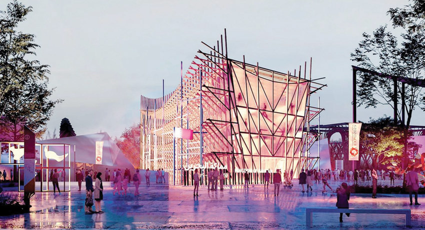 وصمّمت الجناح المهندسة المعمارية اللبنانية لينا الغطمة مع مكتبها لينا الغطمة للهندسة المعمارية «Lina Ghotmeh - Architecture»، وتم بناؤه باستخدام الخشب كمادة رئيسية، ويتمتّع بتبريد طبيعي يعتمد على نسيم البحر، وهو ما يجعله من أكثر المباني استدامةً في الإكسبو.