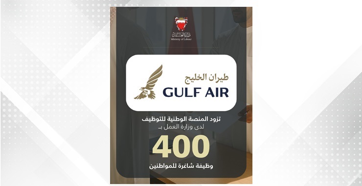 في إطار مواصلة الجهود الوطنية الرامية إلى توفير فرص عمل نوعية للمواطنين وتمكينهم من الإسهام الفاعل في مسيرة التنمية، أعلن سعادة السيد يوسف بن عبدالحسين خلف وزير الشؤون القانونية وزير العمل بالوكالة أن طيران الخليج قامت بتزويد المنصة الوطنية للتوظيف التابعة لوزارة العمل بـ 400 وظيفة شاغرة مخصصة للمواطنين.