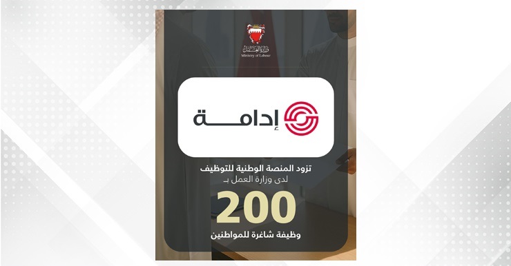 في إطار مواصلة الجهود الوطنية الرامية إلى توفير فرص عمل نوعية للمواطنين وتمكينهم من الإسهام الفاعل في مسيرة التنمية، أعلن سعادة السيد يوسف بن عبدالحسين خلف وزير الشؤون القانونية وزير العمل بالوكالة أن شركة البحرين للاستثمار العقاري (إدامة) قامت بتزويد المنصة الوطنية للتوظيف التابعة لوزارة العمل بـ 200 وظيفة شاغرة مخصصة للمواطنين.