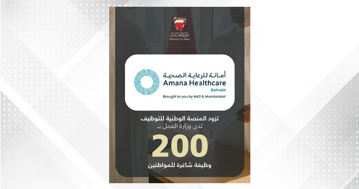في إطار مواصلة الجهود الوطنية الرامية إلى توفير فرص عمل نوعية للمواطنين وتمكينهم من الإسهام الفاعل في مسيرة التنمية، أعلن يوسف بن عبدالحسين خلف وزير الشؤون القانونية وزير العمل بالوكالة أن شركة أمانة للرعاية الصحية قامت بتزويد المنصة الوطنية للتوظيف التابعة لوزارة العمل بـ 200 وظيفة شاغرة مخصصة للمواطنين.