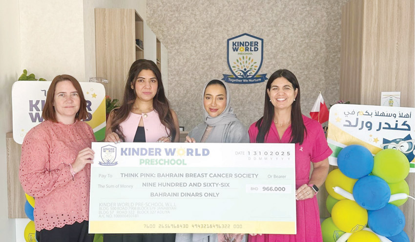 وقامت افشان داداباي، المدير المنتدب لحضانة كيندر وورلد بتسليم حصيلة التبرعات إلى السيدة فاطمة غلوم عضو مجلس إدارة Think Pink Bahrain معبرة عن تضامنها مع مبادرة المؤسسة في دعم المجتمع النسوي في مملكة البحرين.