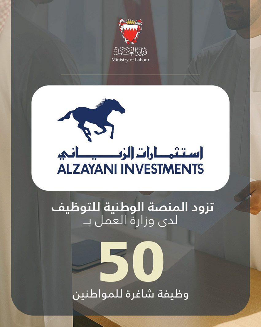 في إطار تنفيذ توجيهات صاحب السمو الملكي الأمير سلمان بن حمد آل خليفة ولي العهد رئيس مجلس الوزراء، بعرض 3 فرص وظيفية لكل باحث عن عمل مسجل لدى وزارة العمل، زودت مجموعة استثمارات الزياني المنصة الوطنية للتوظيف بـ50 وظيفة شاغرة للمواطنين.