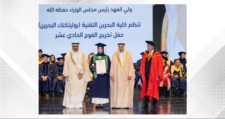 وأعرب معاليه عن تقديره لسعادة وزير التربية والتعليم رئيس مجلس أمناء كلية البحرين التقنية (بوليتكنك البحرين)، وأعضاء مجلس الأمناء، والهيئتين الأكاديمية والإدارية، على ما يولونه من متابعة ودعم لمسيرة الكلية وبرامجها التطويرية، مهنئاً في الوقت ذاته الخريجات والخريجين على هذا الإنجاز الذي يتوجونه اليوم بلحظة التخرج، راجياً لهم مسيرة مكللة بالنجاح في خدمة الوطن، ومعبراً كذلك عن تقديره لأولياء الأمور على دعمهم المتواصل لأبنائهم.