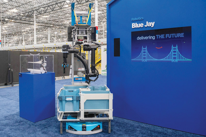 وكانت أذرع «بلو جاي» الروبوتية التي صُوّرت على أنها قادرة على الالتقاط والفرز والدمج بكفاءة في محطة عمل واحدة، من بين معدات مُحسّنة بالذكاء الاصطناعي عرضتها «أمازون» في مؤتمر عقدته في مركز توزيع ضخم تابع لها في سيليكون فالي.