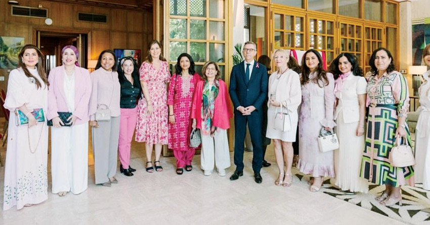 وقد تزينت السفارة الفرنسية باللون الوردي والزهور الوردية كما شاركوا الحضور الملابس الوردية تأكيدا للدعم الكامل لشهر أكتوبر ومبادراته.