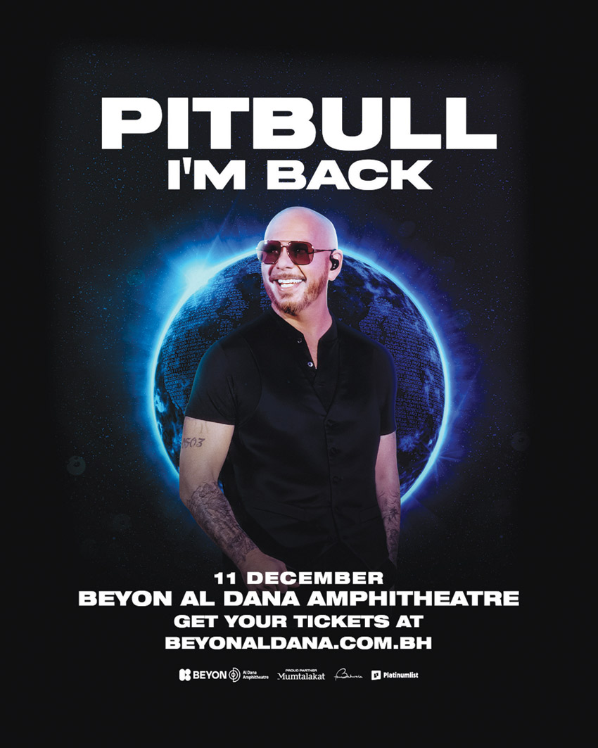 وتمكن النجم الموسيقي العالمي ورائد الأعمال بيتبول – الحائز جائزة غرامي® – من بناء مسيرةً حافلةً في عالم الاستعراض بفضل جاذبيته وطاقته. كما تعاون مع نخبة من ألمع النجوم، واشتهر أيضًا بأغانيه المميزة مثل: «Now or Never» وTimber»» و«Fireball» وغيرها من التي حصدت مليارات المشاهدات، وتصدرت قوائم الأغاني في مختلف بقاع الأرض. ومنذ انطلاق جولته الغنائية «I’m Back»، نفدت جميع تذاكر العرض حول العالم، وأصبحت مملكة البحرين الآن هي محطته التالية، حيث من المتوقع أن يلقى حفله إقبالاً هائلاً منقطع النظير.