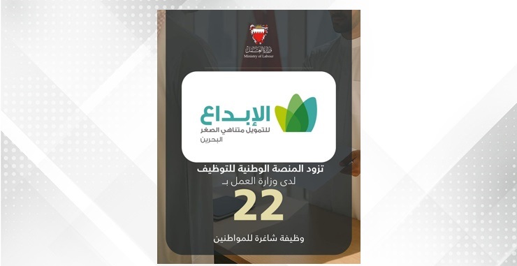 في إطار تنفيذ توجيهات صاحب السمو الملكي الأمير سلمان بن حمد آل خليفة ولي العهد رئيس مجلس الوزراء حفظه الله، بعرض 3 فرص وظيفية لكل باحث عن عمل مسجل لدى وزارة العمل، شركة الإبداع للتمويل متناهي الصغر تزود المنصة الوطنية للتوظيف بـ 22 وظيفة شاغرة للمواطنين.
