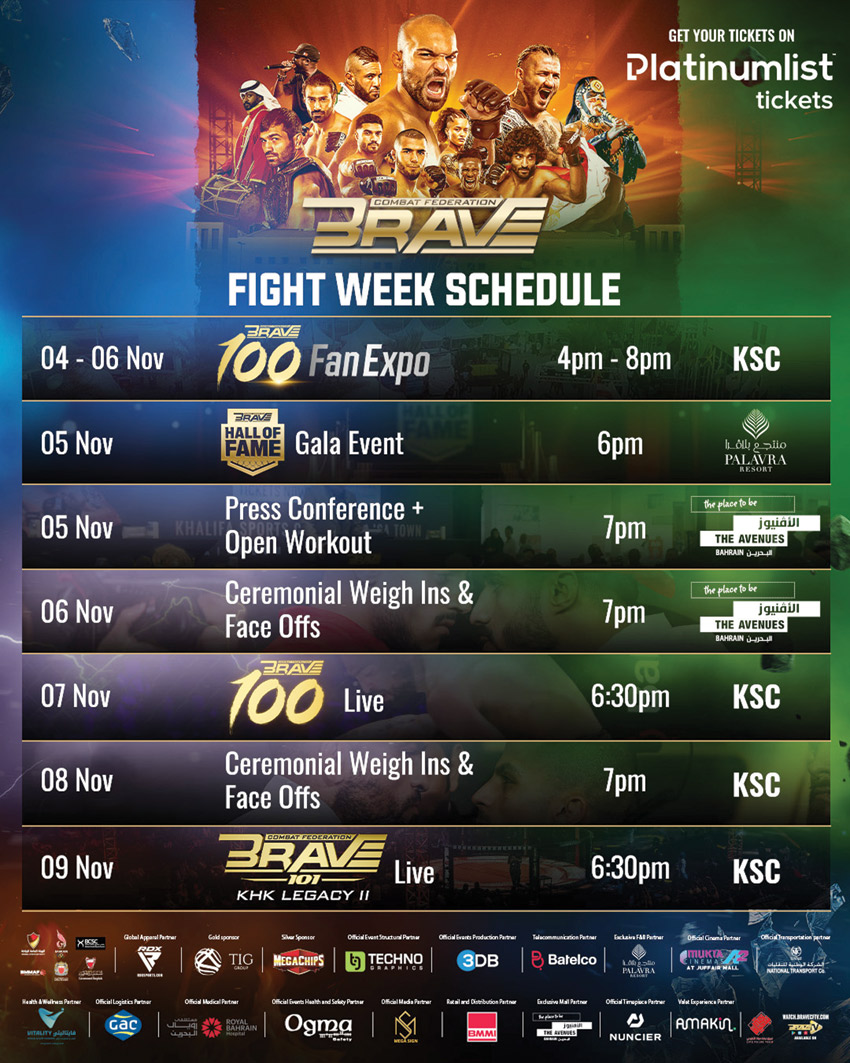 ويشهد يوم 6 نوفمبر إقامة فحص الوزن الرسمي ومواجهة المقاتلين FACE OFF في مجمع الأفنيوز عند الساعة 7 مساءً، والذي يسبق انطلاقة الحدث الرئيسي والتاريخي BRAVE 100 يوم 7 نوفمبر على صالة مدينة خليفة الرياضية عند الساعة 6:30 مساءً.