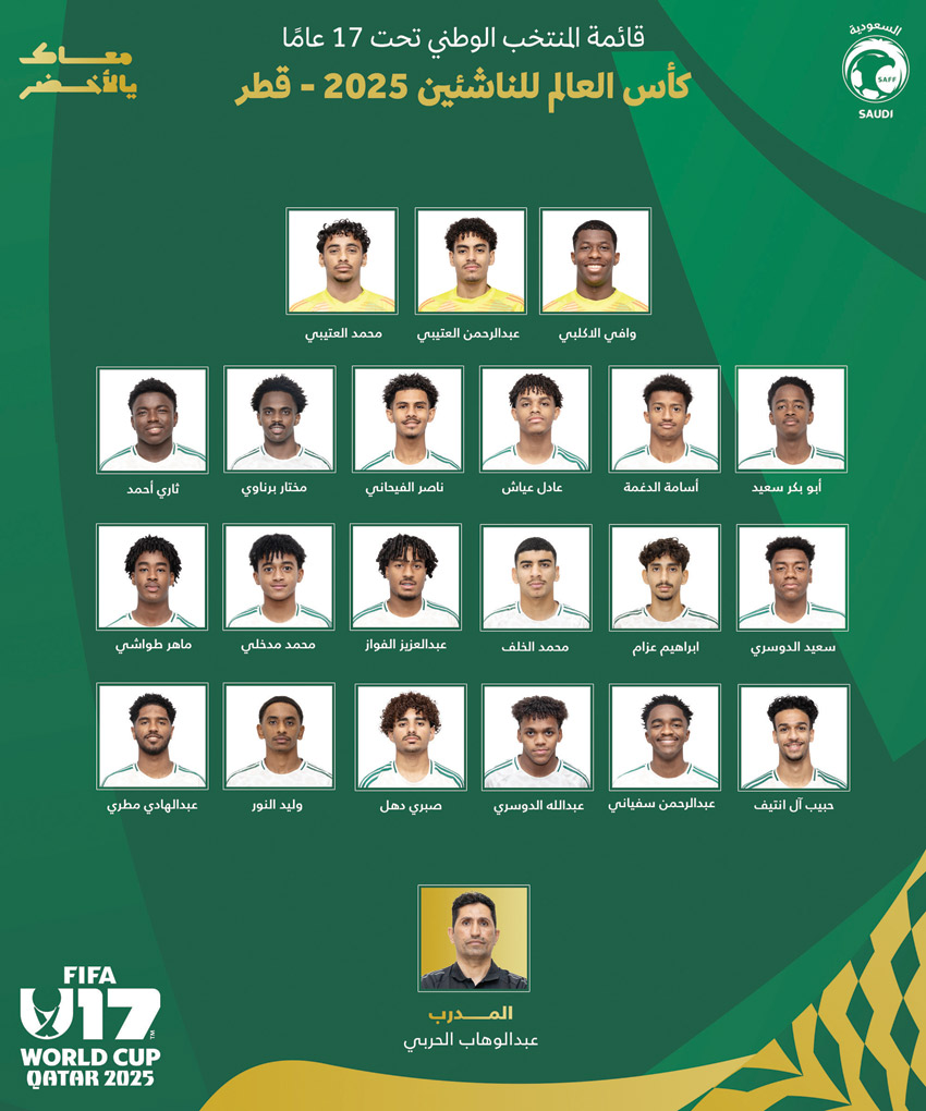 أعلن مدرب المنتخب الوطني تحت 17 عامًا عبدالوهاب الحربي قائمة المنتخب المشاركة في كأس العالم تحت 17 عامًا 2025 في قطر.