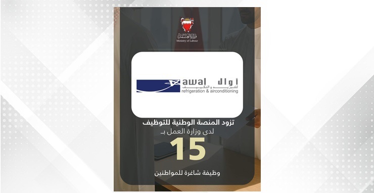 في إطار تنفيذ توجيهات صاحب السمو الملكي الأمير سلمان بن حمد آل خليفة ولي العهد رئيس مجلس الوزراء، بعرض 3 فرص وظيفية لكل باحث عن عمل مسجل لدى وزارة العمل، ورشة أوال لتصليح الثلاجات ومكيفات الهواء تزود المنصة الوطنية للتوظيف بـ 15 وظيفة شاغرة للمواطنين