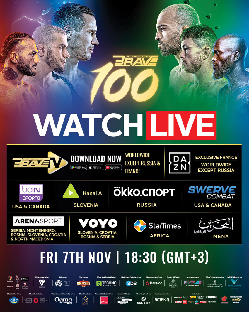تستعد مملكة البحرين لتكون محط أنظار العالم مجددًا مع انطلاق النسخة التاريخية المئوية من بطولةBRAVE 100 ، الحدث الذي يمثل ذروة مسيرة منظمة بريف البحرينية، التي رسخت مكانتها كأسرع منظمات فنون القتال المختلطة نمواً في العالم. ومع بلوغها هذه المحطة المئوية، تحقق BRAVE CF إنجازًا جديدًا يتمثل في توسيع نطاق بثها العالمي ليشمل معظم قارات العالم عبر شبكة من أبرز المنصات والقنوات الرياضية الدولية.