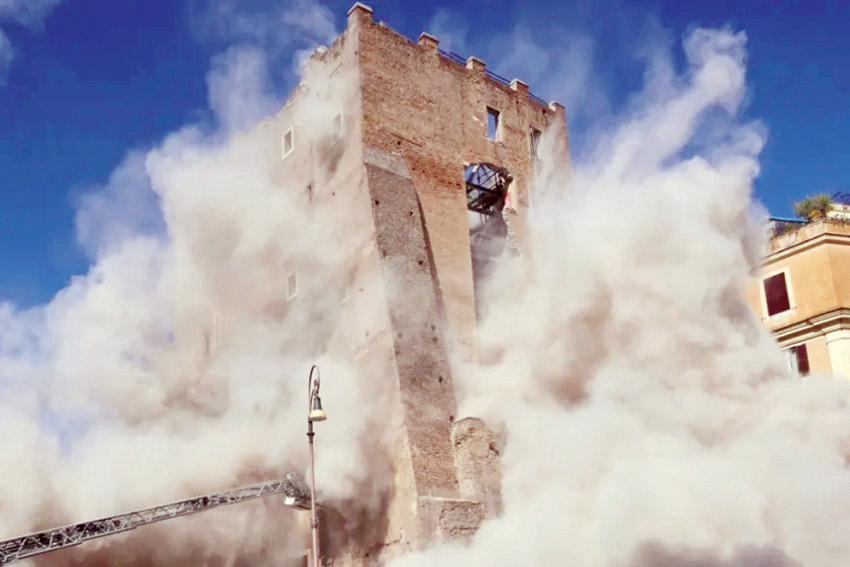 توفي عامل أُنقذ من تحت أنقاض برج من العصور الوسطى انهار في روما ليل الاثنين الثلاثاء، بعد وقت قصير من وصوله إلى المستشفى. وانهار جزء من برج «توريه دي كونتي» الذي يعود إلى العصور الوسطى وكان قيد الترميم بُعَيد الحادية عشرة والنصف صباح الاثنين (09:30 بتوقيت جرينتش)، وتناثرت أنقاض جزء من الواجهة في الشارع، فيما ارتفعت في الجو سحابة بيضاء كثيفة من الغبار. ويقع البرج في منطقة مزدحمة، قبالة المنتدى الإمبراطوري «فوري إمبريالي» وعلى مقربة من الكولوسيوم الذي يُعَد أهم موقع سياحي في إيطاليا. وأفاد ناطق باسم جهاز الإطفاء في تصريح لوكالة فرانس برس بإجلاء ثلاثة عمال كانوا داخل البرج، نُقل أحدهم إلى المستشفى في حال حرجة، فيما بقي عامل تحت الأنقاض تم إنقاذه بعد ساعات ونقل إلى المستشفى لكنه لم ينج. وبقي العامل أوكتاي سترويتشي، وهو مواطن روماني يبلغ 66 عاما، «واعيا» وفق ما أفادت وزارة الخارجية الرومانية، ووضع على جهاز التنفس الاصطناعي لكن نبضه لم يعد رغم محاولات الإنعاش. وقدّم رئيس منطقة لاتسيو فرانشيسكو روكا تعازيه. وكتب على فيسبوك: «لم ينجُ أوكتاي سترويتشي رغم الجهود الاستثنائية التي بذلها عناصر الإنقاذ».