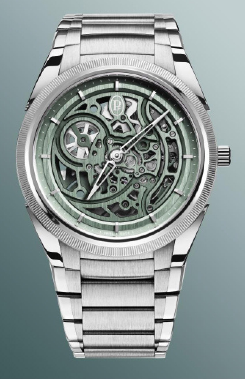 تعكس Tonda PF Skeleton Slate Green رؤية دار بارميجياني فلورييه في فنّ الهيكلة، حيث يجمع التصميم بين الحرفية التقليدية والطابع العصري. وقد تم تفريغ الجسور إلى أقصى حدودها دون التأثير على متانة الحركة أو كفاءة الأجزاء المتحركة، ما يسمح برؤية المكوّنات الداخلية أثناء عملها. تحمل بعض الأجزاء تشطيبات ساتانية ومصقولة يدوياً، بينما يعزز الفولاذ المصقول والتشطيب الساتاني التناسق بين كل العناصر وفق أعلى معايير الساعات الراقية، ليصبح التصميم المفتوح في غاية الدقة والجمال.