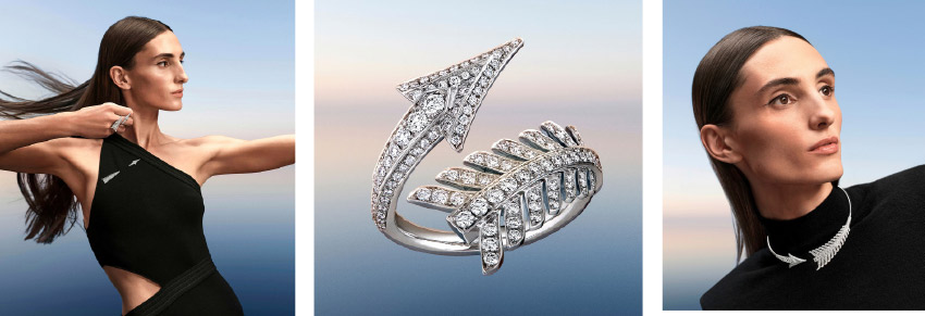 استلهمت كلير شوان من التوتّر الكامن في السهم، ذاك التوازن النادر بين القوّة والدقّة، دافعاً لتكريم هذا الرمز العريق عبر إعادة صياغته بأسلوب جديد لا يُفرّط بجوهره. حيث سعت إلى الحفاظ على حداثة خطوطه ونقاوتها، مع ابتكار طرق معاصرة لارتدائه. فالسهم، وإن ظلّ وفياً لهدفه، بات يراعي الجسد ويلتفّ حول الإصبع أو المعصم، وينساب بسلاسة حول العنق، أو يُثبّت كبروش فوق القلب. وتتألّف هذه المجموعة من ثماني قطع من الماس، أحادية اللون، تليق بالجنسين، وتعبّر جميعها عن رؤية تصميمية عصرية بامتياز. وفي استعادة لروح أرشيف الدار، تبدأ المجموعة بقطعتين تجسّدان السهم بصيغته النقيّة: مشبكان، أحدهما بالغ الرقّة، والثاني بحجم XXL يجمع بين الماسات المستديرة وماسات من قطع الباغيت. يليهما خاتمان: الأوّل يلتفّ حول إصبع واحد، مرصّع بالكامل بالماس المستدير، أما الثاني فيأخذ طابعاً نحتياً يمتدّ على ثلاثة أصابع، في توليفة تجمع بين خفّة الريش المتشكّل من ماس مستدير، وصلابة الخطّ المرسوم بأحجار باغيت مستطيلة. وتضمّ المجموعة أيضاً عقداً وسواراً فائقَي الليونة، يمكن ارتداؤهما من دون مشبك، بالإضافة إلى قلادة وزوج من الأقراط الدائرية، مرصّعة جميعها بماسات مستديرة. تتجلّى براعة صاغة دار بوشرون في هذه المجموعة بأبهى صورها من خلال التعامل الرقيق مع المعدن، والدقّة المتناهية في ترصيع الماسات، والانضباط الهندسي في رسم كلّ خط. فكلّ قطعة صيغت بأسلوب يكاد يلامس النحت، بهدف تجسيد حركة السهم وتكثيف طاقته الحيوية، فتحوّلت الخطوط البسيطة إلى بيان تصميمي معاصر، يحمل توقيع الدار وروحها المتجدّدة. واحتفالاً بإطلاق هذه الابتكارات الجديدة، تكشف دار بوشرون عن حملة تعبّر عن الطاقة الكامنة في رمزية السهم، وتحتفي بصفات الثقة والصلابة في السلوك. في حركات مستوحاة من عالم الرماية، تجسّد امرأة ورجل هذه الإبداعات بأسلوب شخصي وحميم. ورغم غياب القوس، فإن عزيمتهما حاضرة في كلّ حركة، إذ لا يستهدفان جسماً مادياً بل غاية ذهنية، من خلال تصاميم تتجلّى بالفعل والتعبير.