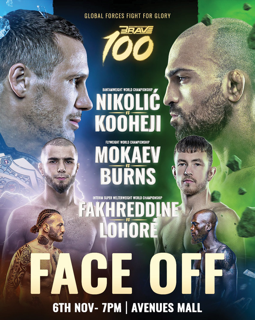 يشهد اليوم الخميس إجراء مراسم الفحص الرسمي للوزن والمواجهة «فيس أوف» بين المقاتلين المشاركين في بطولةBRAVE 100 ، وذلك عند الساعة السابعة مساءً في مجمع الأفنيوز.