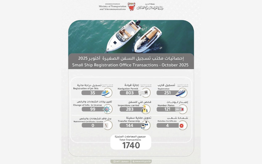 أنجز مكتب تسجيل السفن الصغيرة بوزارة المواصلات والاتصالات 1740 معاملة خلال أكتوبر 2025، وذلك بنسبة انخفاض طفيف بلغ 0.34% مقارنة بعدد المعاملات خلال شهر سبتمبر والتي بلغت 1746.