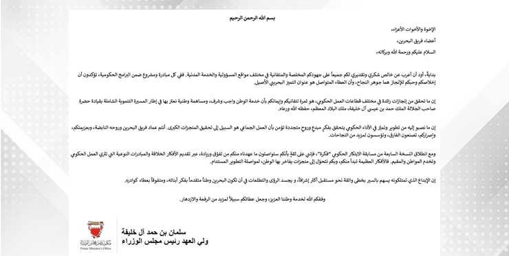 إن ما نصبو إليه من تطوير وتميّز في الأداء الحكومي يتحقق بفكرٍ مبدعٍ وروحٍ متجددة تؤمن بأن العمل الجماعي هو السبيل إلى تحقيق المنجزات الكبرى. أنتم عماد فريق البحرين وروحه النابضة، وبعزيمتكم، وإصراركم، تصنعون الفارق، وتؤسسون لمزيد من النجاحات.