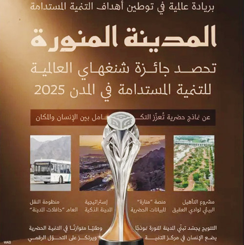 ويجسد هذا التتويج تبني المدينة المنورة نموذجا وطنيا متوازنا في التنمية الحضرية يضع الإنسان في مركز التنمية، ويرتكز على التحوّل الرقمي، وحماية البيئة، وتعزيز التنمية المستدامة.
