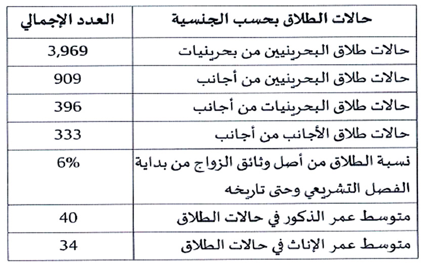 وأفادت وزارة العدل بأن إحصاءات حالات الطلاق الموثقة بالمحاكم الشرعية خلال الفترة من بداية الفصل التشريعي السادس وحتى الآن بلغت 5607، وأن حالات الطلاق بين الأزواج البحرينيين والبحرينيات بلغت 3969 حالة، فيما بلغت نسبة الطلاق من أصل وثائق الزواج من بداية الفصل التشريعي وحتى تاريخه 6%.