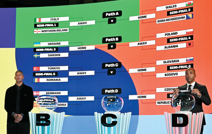 وتلتقي أوكرانيا مع السويد، وبولندا مع ألبانيا في نصف نهائي المسار الثاني، وتركيا مع رومانيا، وسلوفاكيا مع كوسوفو في نصف نهائي المسار الثالث، والدنمارك مع مقدونيا الشمالية، وجمهورية تشيكيا مع جمهورية ايرلندا في نصف نهائي المسار الرابع.