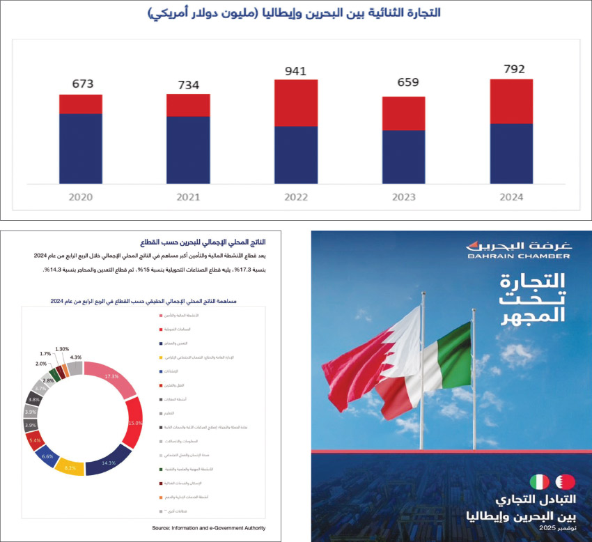 أفاد تقرير التجارة تحت المجهر لـ«غرفة تجارة وصناعة البحرين»، الصادر بعنوان «التبادل التجاري بين البحرين وإيطاليا»، بأن العلاقات البحرينية الإيطالية نموذج للشراكة المبنية على أسس اقتصادية وتاريخية متينة. إذ يعود هذا الارتباط القوي إلى سبعينيات القرن الماضي، عندما لعبت التكنولوجيا والآلات الإيطالية دورًا حيويًا في دفع عجلة التنمية الصناعية والتحديث في البحرين.