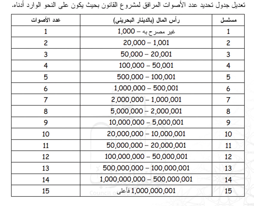بدورها اشارت وزارة الصناعة والتجارة الى ان جدول الأصوات الحالي يحقق التوازن بين المؤسسات وفقا لحجم رؤوس الأموال، بحيث يكون التصويت بما يساوي حجم الاستثمار الفعلي في مملكة البحرين، لافتة الى انه من الاجدى إذا وجدت أي شكاوى او إشكاليات تتعلق بجدول تحديد عدد الأصوات المعمول به وفق القانون الحالي، ان تتم اثارة ذلك أولا من قبل المعنيين في اجتماعات الجمعية العمومية للغرفة، مؤكدة انه لم ترد مثل تلك الشكاوى والاشكاليات.