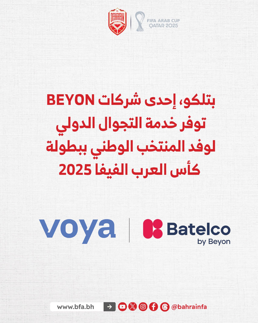 قدمّت شركة بتلكو، إحدى شركات Beyon دعمها لمنتخب البحرين لكرة القدم المشارك في بطولة كأس العرب الفيفا 2025، من خلال توفير خدمة التجوال الدولي «Voya» لأعضاء وفد المنتخب خلال البطولة التي ستقام في قطر في الفترة من 1 وحتى 18 ديسمبر 2025.