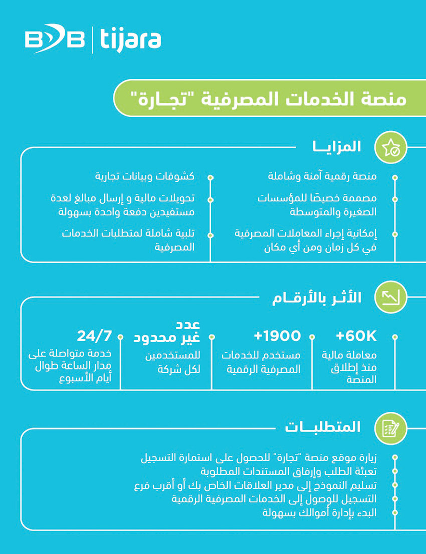 تُعد منصة «تجارة» التابعة لبنك البحرين للتنمية، حلاً رقميًا آمنًا يتيح للمؤسسات الصغيرة والمتوسطة إدارة عملياتها المالية بكل سهولة. ومع تنفيذ أكثر من 60,000 معاملة وانضمام ما يزيد على 1900 مستخدم حتى اللحظة، توفر المنصة تجربة مصرفية متكاملة تشمل التحويل الفوري، وإمكانية الوصول الى الخدمات على مدار الساعة طوال أيام الأسبوع. كما أنه باستطاعة الشركات إضافة عدد غير محدود من المستخدمين، بما يضمن إدارة الأعمال المصرفية في أي وقت ومن كل مكان، وبأسلوب يلائم احتياجات بيئة الأعمال المتسارعة.