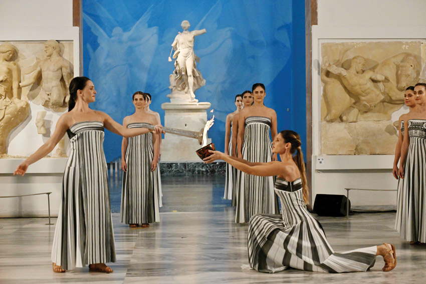 وبسبب الأمطار المتوقعة في الموقع الأثري، لم يتم إشعال الشعلة بالطريقة التقليدية باستخدام أشعة الشمس، بل استعان المنظمون بالشعلة التي أُضيئت الاثنين خلال بروفة بواسطة أشعة الشمس، وتم الاحتفاظ بها وتسليمها لأول حامل للشعلة، الرياضي اليوناني بيتروس غايداتزيس، الحائز الميدالية البرونزية في منافسات التجذيف في أولمبياد باريس 2024.