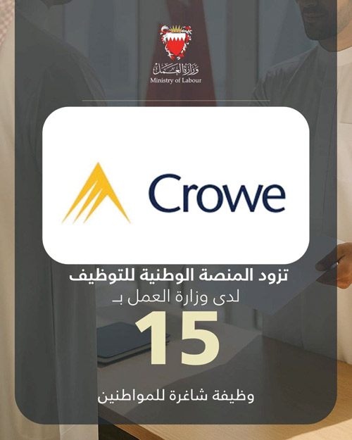 في إطار تنفيذ توجيهات صاحب السمو الملكي الأمير سلمان بن حمد آل خليفة ولي العهد رئيس مجلس الوزراء، بعرض 3 فرص وظيفية لكل باحث عن عمل مسجل لدى وزارة العمل، «كرو بي إج» شركة تضامن مهنية تزود المنصة الوطنية للتوظيف بـ15 وظيفة شاغرة للمواطنين.