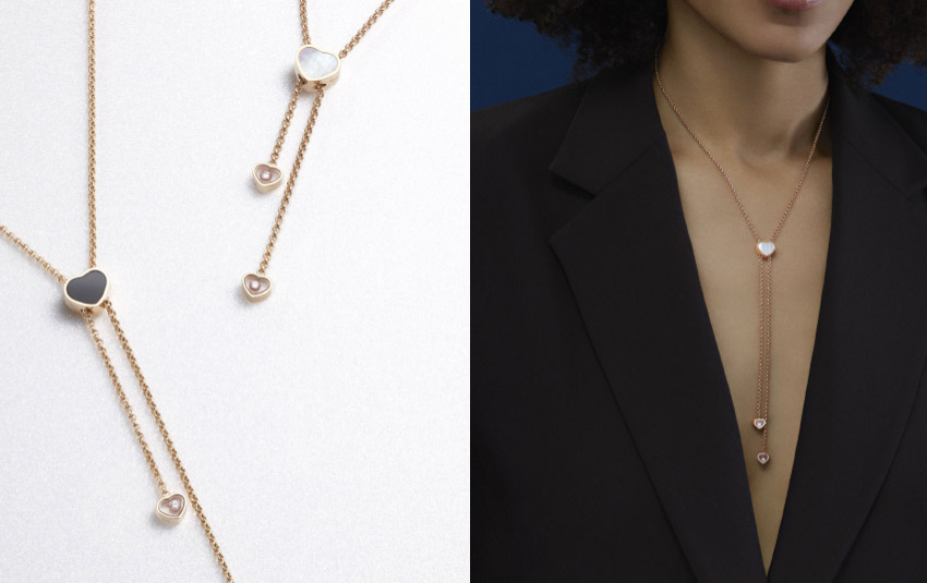 ويقدم الطقم الجديد ضمن مجموعة Happy Hearts حضوراً مميزاً لزجاج الأفينتورين الأزرق من خلال قلادة وسوار مصنوعين من الذهب الأبيض الأخلاقي عيار 18 قيراطا. ويتميز هذا الزجاج بمظهره العميق المشابه لسماء مرصعة بالنجوم بفضل شوائبه المتلألئة. وتعود قصته إلى القرن السابع عشر حين سقطت برادة النحاس بالصدفة في زجاج منصهر داخل ورشة لصناعة زجاج المورانو، ما أدى إلى ظهور هذا النوع الفريد الذي حمل اسم «أفينتورين»، المشتق من الكلمة الايطاليةper avventura وتعني «بالصدفة».