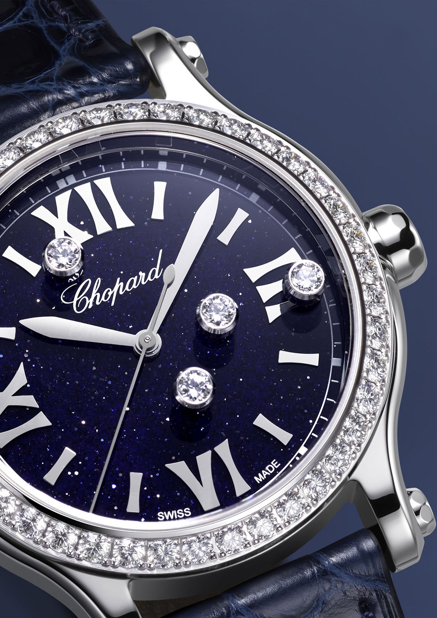 وتتجسد روحHappy Sport في خمس ألماسات حرة الحركة، تدور وتتمايل فوق المينا لتخلق عروضاً ضوئية متجددة عند كل حركة للمعصم. وتُعد هذه الألماسات بمثابة تمائم سعادة ترمز للحظ والانسجام، ويعكس رقصها العفوي النسب المثالية التي صممت بها الساعة، معززاً تألق الإطار المرصع بالألماس.