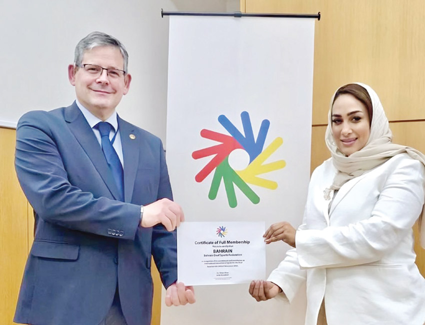 وتسلّمت الشهادة رئيسة الاتحاد مريم فؤاد آل شهاب من رئيس اللجنة الدولية لرياضات الصم آدم كوسا، في مشهد عكس المكانة المتنامية للاتحاد البحريني ودوره المتقدم في دعم وتطوير رياضات الصم في المملكة.