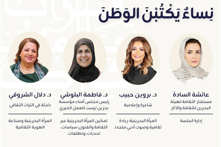 بمناسبة يوم المرأة البحرينية، تنظم هيئة البحرين للثقافة والآثار، جلسة ثقافية بعنوان «نساء يكتبن الوطن»، وذلك يوم الأربعاء الموافق 3 ديسمبر 2025، في تمام الساعة 7 مساءً، بمركز الفنون.